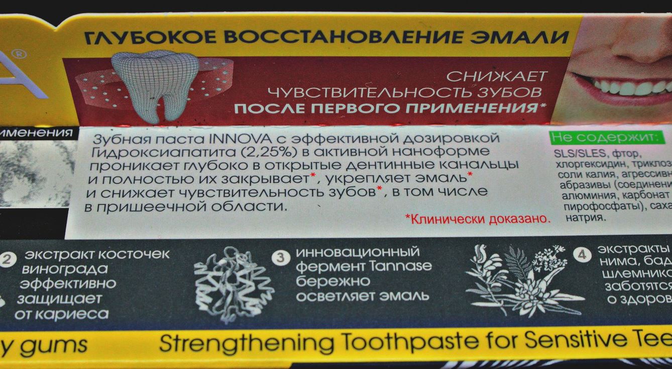 Для тех, кто остро реагирует на холодную и горячую пищу или другие раздражители, специальная зубная паста для чувствительных зубов может стать настоящим спасением. В зубной пасте INNOVA “Восстановление эмали и здоровье десен» содержится инновационный аморфный nanoHAP (Гидроксиапатит), который аналогичен веществу, из которого состоит зубная эмаль. Он проникает глубоко в повреждения на поверхности зубов и закрывает дентинные канальца, что впоследствии заметно снижает их чувствительность.